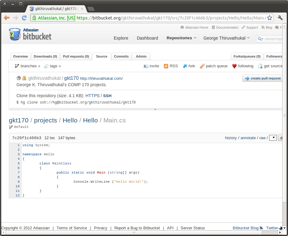 If all was done properly, you will see .hgignore and labs. These were all the result of our earlier sequence of commit+push operations. You can click on any folder to drill into the hierarchy of folders/files that have been pushed to Bitbucket (from your local repository). In labs you find your source code (for hello.cs). Then you can look at it–through the web! When you do so, you’ll see something like this.
