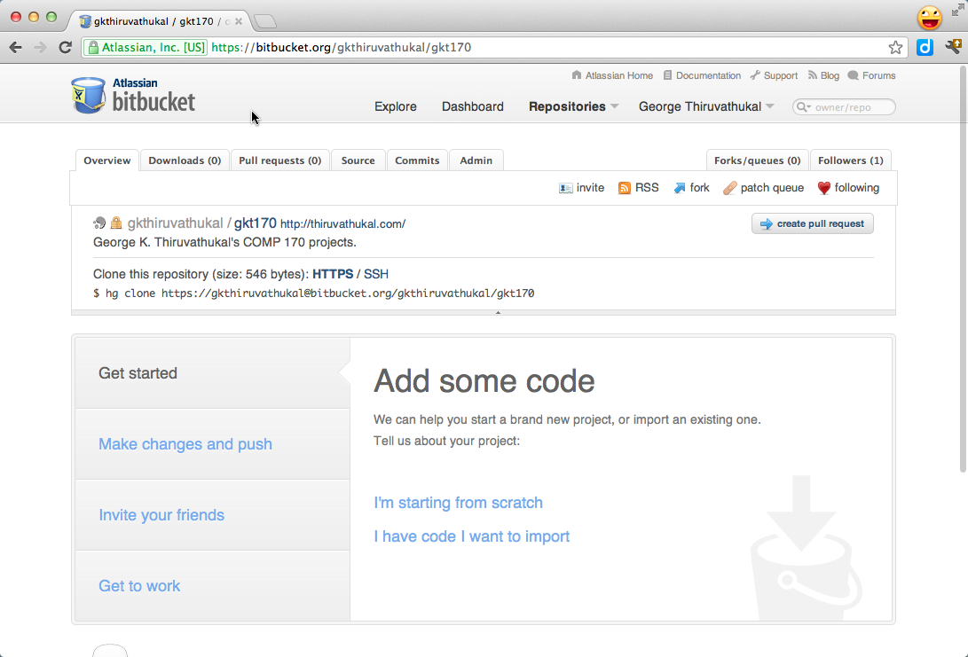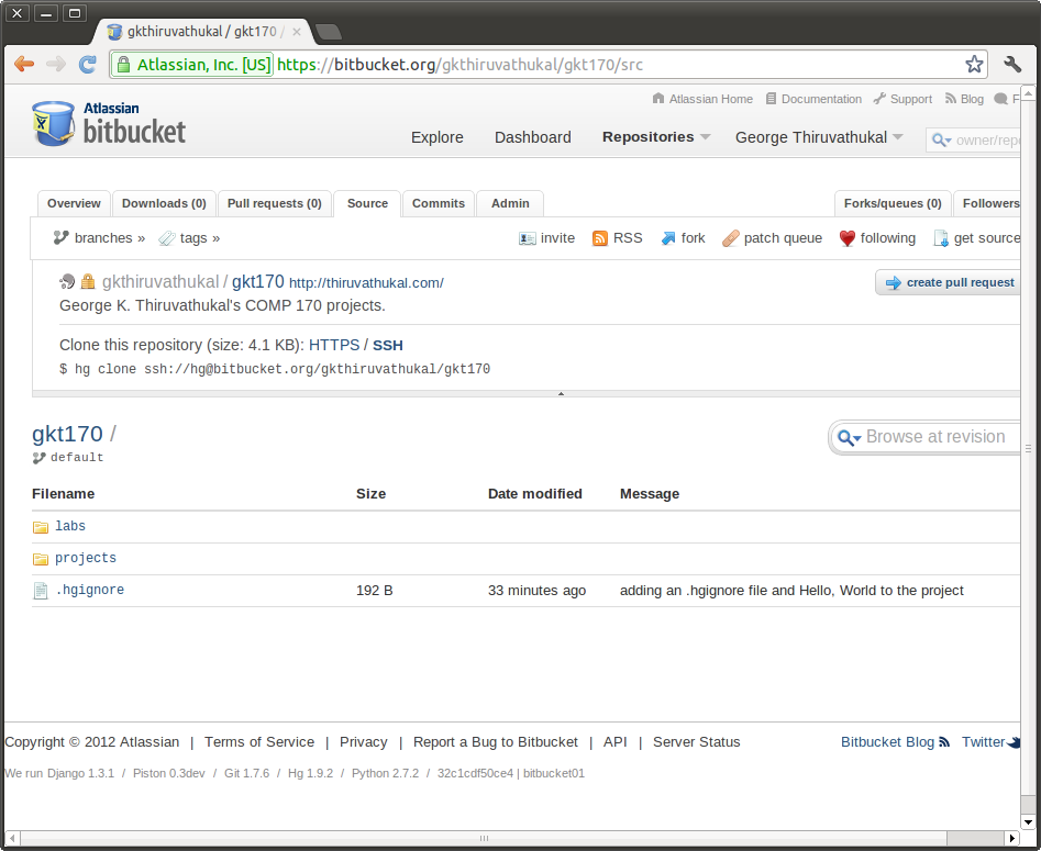 gkt@gkt-mini:~/gkt170$ hg commit -m "adding hello program" gkt@gkt-mini:~/gkt170$ hg push pushing to https://gkthiruvathukal@bitbucket.org/gkthiruvathukal/gkt170\ searching for changes remote: adding changesets remote: adding manifests remote: adding file changes remote: added 1 changesets with 1 change to 1 file remote: bb/acl: gkthiruvathukal is allowed. accepted payload.